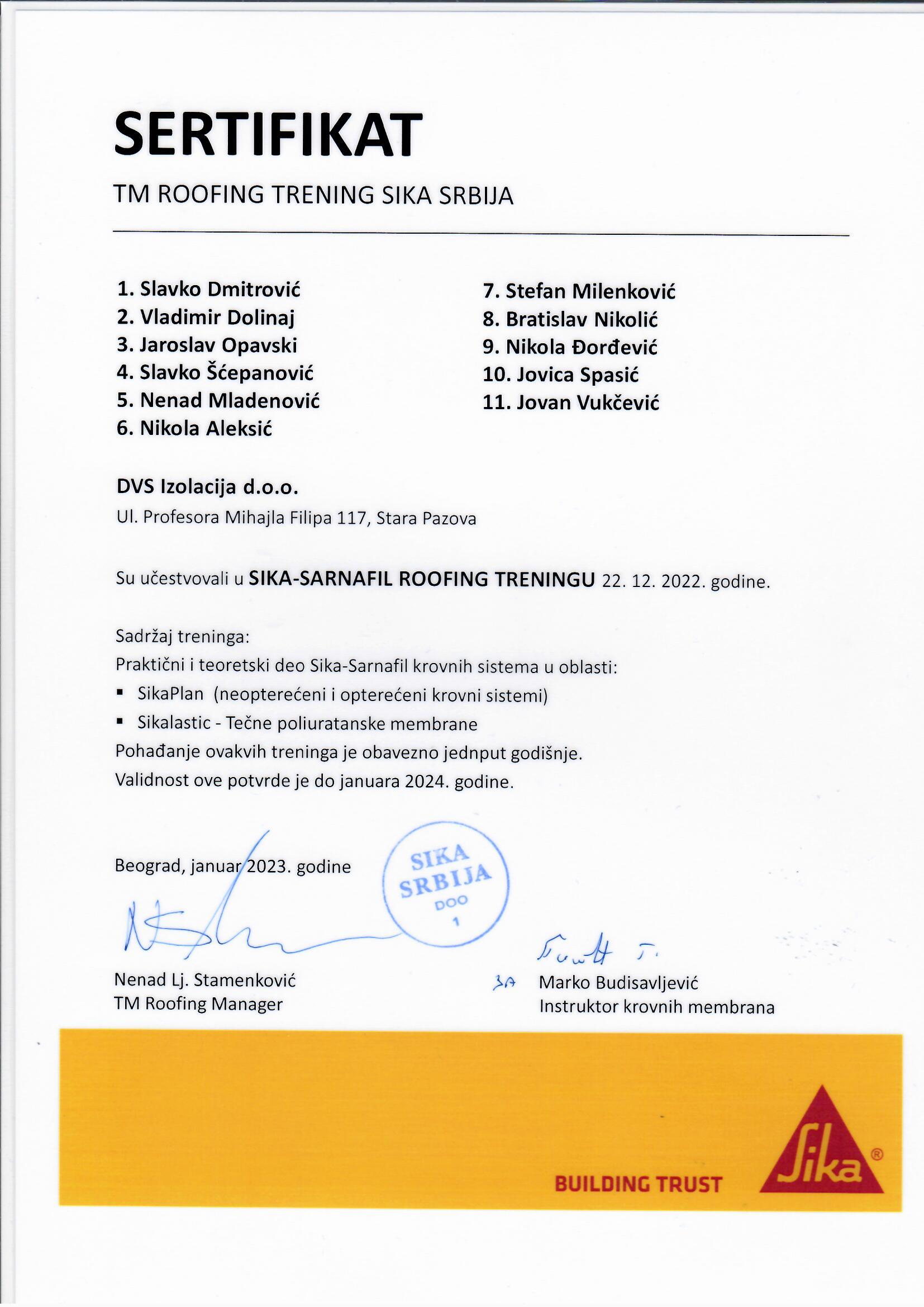 Od samog početka poslovanja “DVS Izolacija” d.o.o. nastoji da usavrši znanje i veštine svojih zaposlenih, tako su i ove godine naši hidroizolateri prošli obuku – TM Roofing trening, proizvođača hidroizolacije “Sika Srbija” d.o.o., za montažu PVC i FPO krovnih hidroizolacionih membrana, kao i tečnih poliuretanskih krovnih membrana. Do sada posedujemo sertifikate za svaku godinu poslovanja, […]