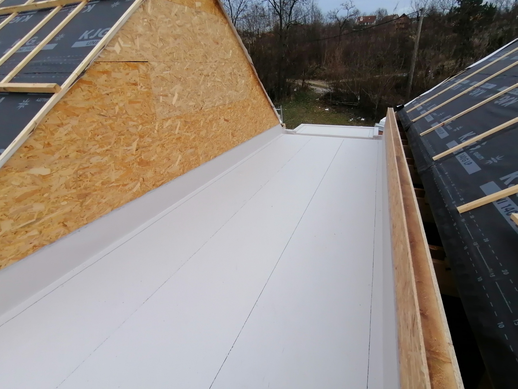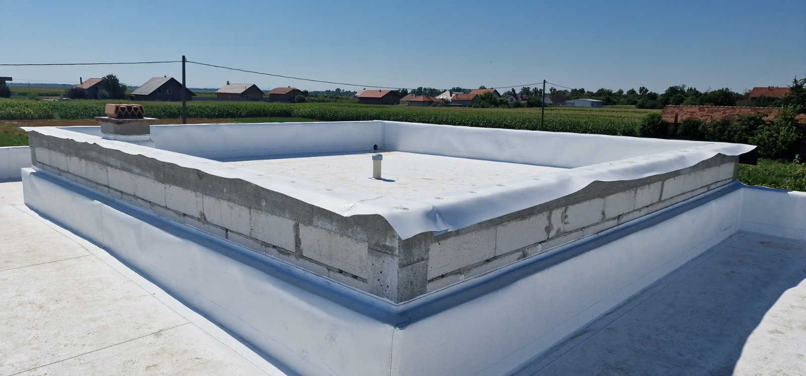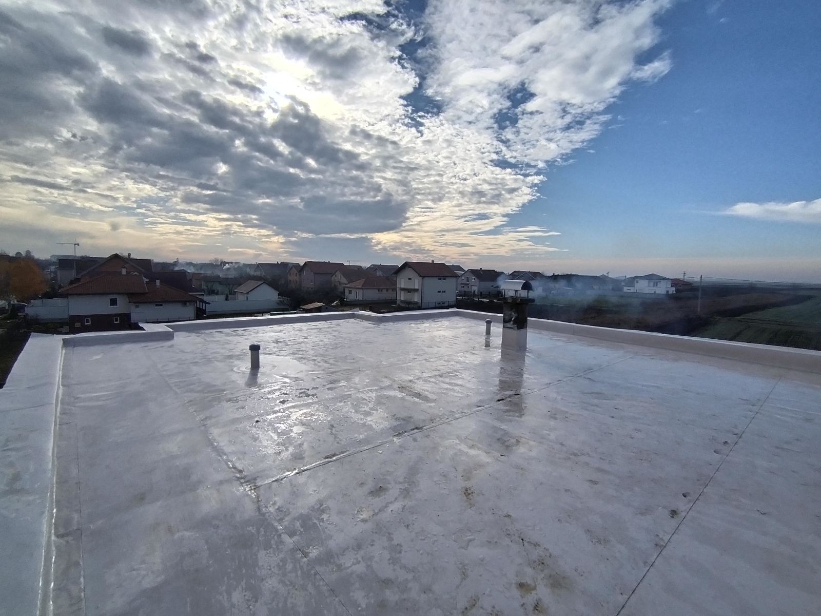 Nastavlja se niz radova na stambenim objektima. Na krovu ovog stambenog objekta u Staroj Pazovi postavljena je FPO hidroizolacija Sikaplan TM 15 – bele boje. Krov sa sastoji iz više kaskada, odnosno posebnih celina, od ukupno oko 280 m2. U nastavku pogledajte fotografije nakon izvedenih radova: